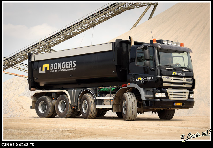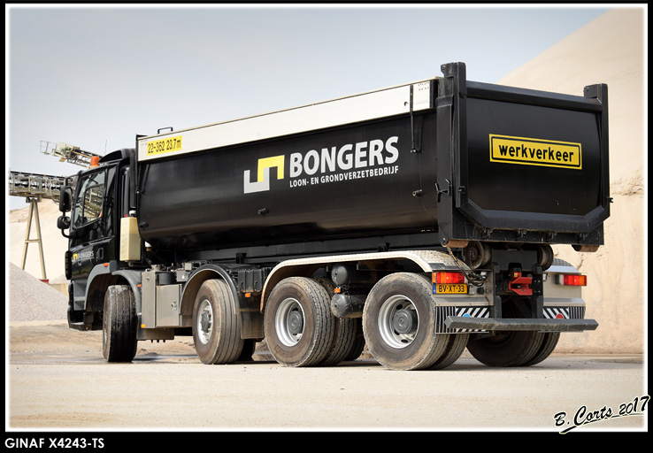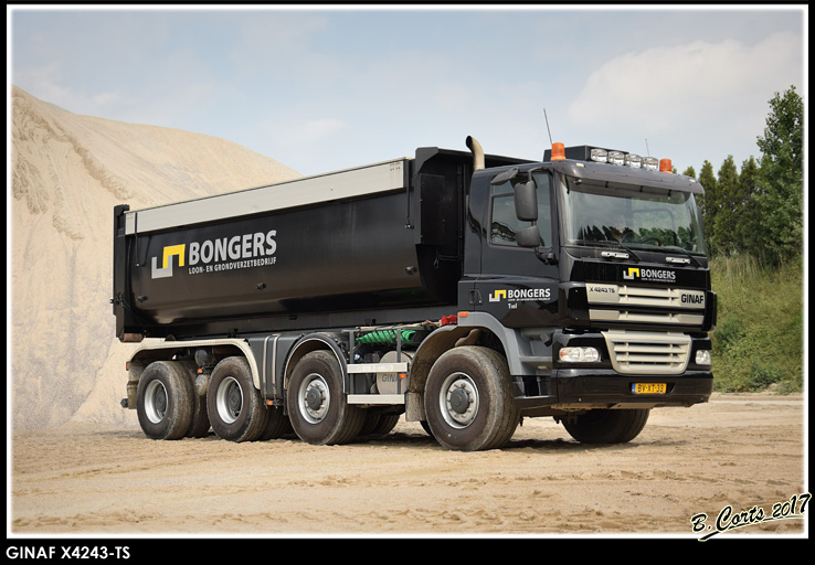 Een GINAF X4243-TS van Loonbedrijf Bongers uit Tiel (Gld). Deze containerauto met haakarmsysteem heeft een eerste leven gehad bij Theo Pouw uit Utrecht.